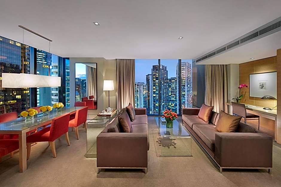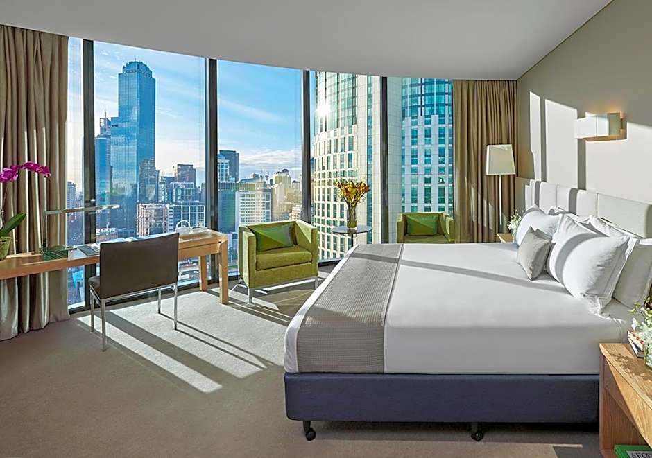 Corner King Rooms offer a spacious room with relaxed tones and thoughtful design touches. There is floor to ceiling windows with views of Melbourne's city skyline. In-room features include a king size bed, desk, large walk-in shower, and free internet.